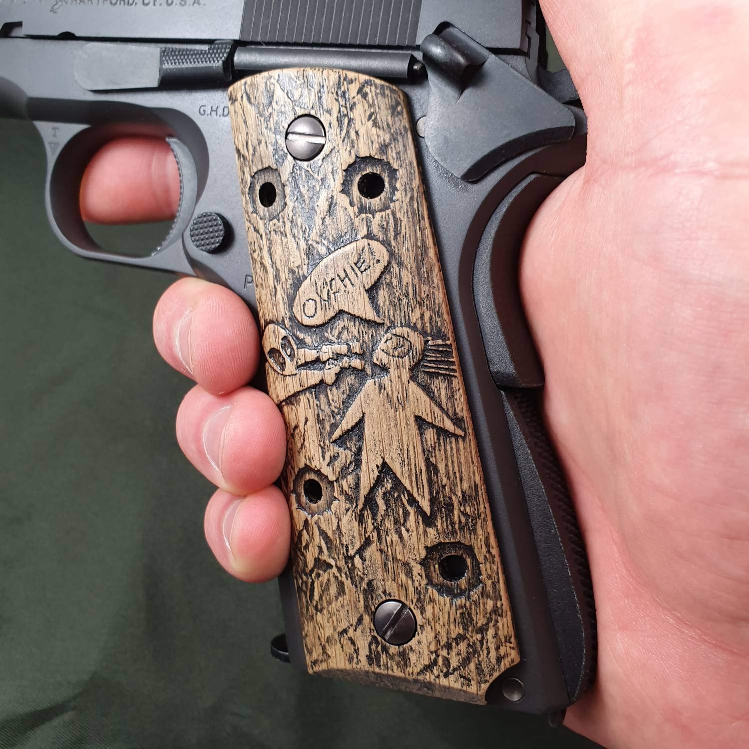 Custom sapele wood grips to fit colt swiss arms p1911 etc. If there is a logo or image you like to see on a grip send me a message. I wanted to create some deadpool inspired 1911 grips so i fired up tinkercad and made some for my prop 1911 and real one! This is the second installment of our custom 1911 undercutting the trigger guard on a 1911 pistol allows the shooter to gain a high grip on the pistol. It's the aw custom ne2201.